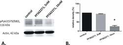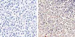 - Immunohistochemistry analysis of Phospho-Pyk2 (pYpY579/580) showing staining in the cytoplasm and nucleus of paraffin-embedded human spleen tissue (right) compared to a negative control without primary antibody (left). To expose target proteins, antigen retrieval was performed using 10mM sodium citrate (pH 6.0), microwaved for 8-15 min. Following antigen retrieval, tissues were blocked in 3% H2O2-methanol for 15 min at room temperature, washed with ddH2O and PBS, and then probed with a Phospho-Pyk2 (pYpY579/580) polyclonal antibody (Product # 44-636G) diluted in 3% BSA-PBS at a dilution of 1:20 overnight at 4ºC in a humidified chamber. Tissues were washed extensively in PBST and detection was performed using an HRP-conjugated secondary antibody followed by colorimetric detection using a DAB kit. Tissues were counterstained with hematoxylin and dehydrated with ethanol and xylene to prep for mounting.