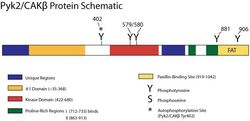- Pyk2 Protein Schematic-Pyk2, also known as CAK, CADTK, RAFTK, FAK2 and the proline-rich/Ca++-activated tyrosine kinase enzyme is a cytoplasmic protein tyrosine kinase (PTK) that plays a key role in integrating signals initiated by a diverse group of extracellular stimuli, including integrin binding, bioactive peptides, growth factors, cytokines, chemokines and certain stress stimuli. Pyk2, and its related family-member, FAK, regulate a host of cellular decisions ranging from cell morphology, migration, cell cycle regulation and apoptosis. Pyk2 is phosphorylated on multiple tyrosine residues, regulating both enzymatic activity and pathway selectivity. Serine phosphorylation appears to be prominent during mitosis, implicating its role in cell cycle regulation.