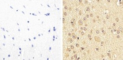 - Immunohistochemistry analysis of Phospho-Pyk2 (pYpY579/580) showing staining in the cytoplasm and nucleus of paraffin-embedded mouse brain tissue (right) compared to a negative control without primary antibody (left). To expose target proteins, antigen retrieval was performed using 10mM sodium citrate (pH 6.0), microwaved for 8-15 min. Following antigen retrieval, tissues were blocked in 3% H2O2-methanol for 15 min at room temperature, washed with ddH2O and PBS, and then probed with a Phospho-Pyk2 (pYpY579/580) polyclonal antibody (Product # 44-636G) diluted in 3% BSA-PBS at a dilution of 1:20 overnight at 4ºC in a humidified chamber. Tissues were washed extensively in PBST and detection was performed using an HRP-conjugated secondary antibody followed by colorimetric detection using a DAB kit. Tissues were counterstained with hematoxylin and dehydrated with ethanol and xylene to prep for mounting.