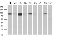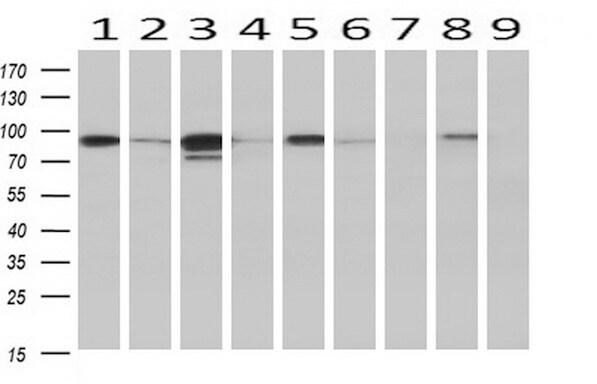 - Western blot analysis of extracts (10 µg) from 9 Human tissue by using anti-STAT5A monoclonal antibody at 1:200 (1: Testis; 2: Omentum; 3: Uterus; 4: Breast; 5: Brain; 6: Liver; 7: Ovary; 8: Thyroid gland; 9: colon).