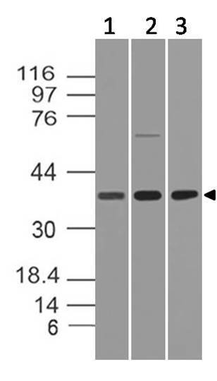- Western blot analysis of HtrA2. Anti-HtrA2 antibody (Clone: ABM1H83) was used at 4 µg/ml on hSpleen, HT-29 and hKidney lysates.
