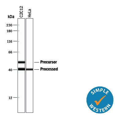 - Detection of Human and Mouse HTRA2/Omi by Simple WesternTM. Simple Western lane view shows lysates of C2C12 mouse myoblast cell line and HeLa human cervical epithelial carcinoma cell line, loaded at 0.2 mg/mL. Specific bands were detected for HTRA2/Omi at approximately 51 kDa (precursor) and 41 kDa (processed) (as indicated) using 2.5 µg/mL of Rabbit Anti-Human/Mouse/Rat HTRA2/Omi Antigen Affinity-purified Polyclonal Antibody (Catalog # AF1458). This experiment was conducted under reducing conditions and using the 12-230 kDa separation system.