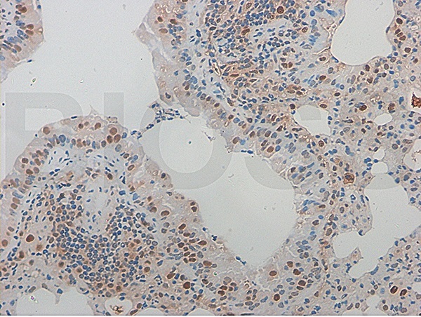 - Formalin-fixed and paraffin embedded human endometrium carcinoma labeled with Rabbit Anti-NFKB p65 Polyclonal Antibody (bs-0465R), Unconjugated at 1:200 followed by conjugation to the secondary antibody and DAB staining.
