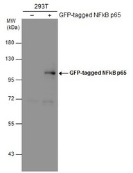 - NFkB p65 antibody detects NFkB p65 protein by western blot analysis. Non-transfected (-) and NFkB p65 -transfected (+, inculding GFP-tag) 293T whole cell extracts (30 ?g) were separated by 7.5% SDS-PAGE, and the membrane was blotted with NFkB p65 antibody (GTX102090) diluted at 1:5000.