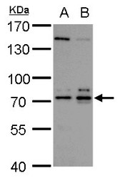 - NFkB p65 antibody detects NFkB p65 protein by western blot analysis.A. 30 ?g 293T whole cell lysate/extract B. 30 ?g A431 whole cell lysate/extract 7.5% SDS-PAGENFkB p65 antibody (GTX107678) dilution: 1:1000The HRP-conjugated anti-rabbit IgG antibody (GTX213110-01) was used to detect the primary antibody.