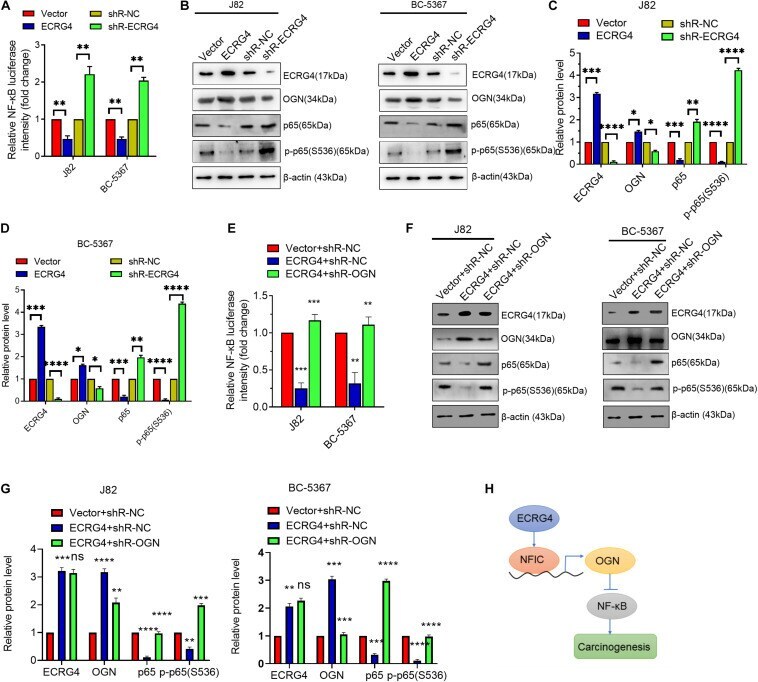 - FIGURE 6 ECRG4 inhibits the NF-kappaB pathway via the upregulation of OGN in BCa cells. (A) NF-kappaB transcriptional activity was detected using an NF-kappaB luciferase reporter gene system. (B) Western blotting detected the protein levels of ECRG4, OGN, p65, and p-p65 (S536) in BCa cells after transfection with ECRG4-overexpressing or silencing plasmids. (C,D) Quantification of the protein levels of ECRG4, OGN, p65, and p-p65 (S536) in panel (B) . (E) The NF-kappaB luciferase reporter gene system was used to detect the NF-kappaB transcriptional activity of BCa cells after transfection with indicated plasmids. (F) Western blotting detected the protein levels of p65 and p-p65 (S536) in BCa cells after transfection with the indicated plasmids. (G) Quantification of the protein levels of p65 and p-p65 (S536) in panel (F) . (H) The proposed mechanism of ECRG4 inhibition of the carcinogenesis of BCa cells via NFIC/OGN/NF-kappaB signaling. (A-G) ANOVA followed by Bonferroni's post hoc test. All data were replicated three times. * p < 0.05, ** p < 0.01, *** p < 0.001, **** p < 0.0001.