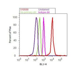 - Flow cytometry analysis of NFkB [p65] was done on HeLa cells. Cells were fixed with 70% ethanol for 10 minutes, permeabilized with 0.25% Tritonª X-100 for 20 minutes, and blocked with 5% BSA for 30 minutes at room temperature. Cells were labeled with NFkB [p65] Rabbit Polyclonal Antibody (510500, red histogram) or with rabbit isotype control (pink histogram) at 3-5 µg/million cells in 2.5% BSA. After incubation at room temperature for 2 hours, the cells were labeled with Alexa Fluor¨ 488 Goat Anti-Rabbit Secondary Antibody (A11008) at a dilution of 1:400 for 30 minutes at room temperature. The representative 10,000 cells were acquired and analyzed for each sample using an Attune¨ Acoustic Focusing Cytometer. The purple histogram represents unstained control cells and the green histogram represents no-primary-antibody control.
