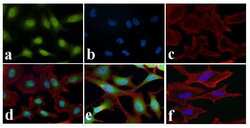- Immunofluorescence analysis of NFkB (p65) was done on 70% confluent log phase HeLa cells treated with TNF-alpha (50 ng/mL for 20 min). The cells were fixed with 4% paraformaldehyde for 15 minutes, permeabilized with 0.25% Triton X-100 for 10 minutes, and blocked with 5% BSA for 1 hour at room temperature. The cells were labeled with NFkB (p65) Rabbit polyclonal Antibody (Product # 51-0500) at 2 µg/mL in 1% BSA and incubated for 3 hours at room temperature and then labeled with Alexa Fluor 488 Goat Anti-Rabbit IgG Secondary Antibody (Product # A-11008) at a dilution of 1:400 for 30 minutes at room temperature (Panel a: green). Nuclei (Panel b: blue) were stained with SlowFade® Gold Antifade Mountant DAPI (Product # S36938). F-actin (Panel c: red) was stained with Alexa Fluor 594 Phalloidin (Product # A12381). Panel d is a merged image showing nuclear localization upon treatment. Panel e shows untreated HeLa cells with cytoplasmic localization. Panel f shows no primary antibody control. The images were captured at 20X magnification.
