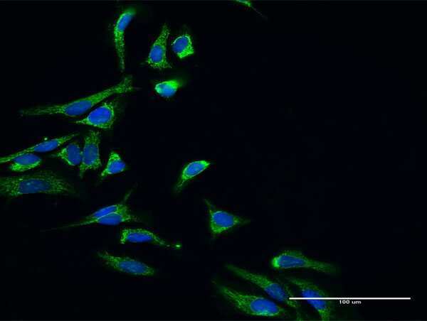 - Immunofluorescence of purified MaxPab antibody to HSD17B10 on HeLa cell. Antibody concentration is 30 µg/mL.