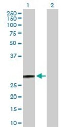 - Western Blot analysis of HSD17B10 expression in transfected 293T cell line (H00003028-T02) by HSD17B10 MaxPab polyclonal antibody.Lane 1: HSD17B10 transfected lysate(26.90 KDa).Lane 2: Non-transfected lysate.
