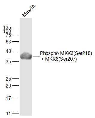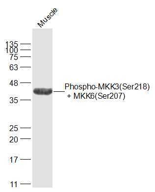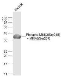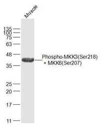 - Mouse muscle lysates probed with MKK3(Ser218) + MKK6(Ser207) Polyclonal Antibody, Unconjugated (bs-3274R) at 1:1000 dilution and 4°C overnight incubation. Followed by conjugated secondary antibody incubation at 1:20000 for 60 min at 37°C.