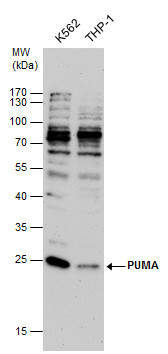 - PUMA antibody detects PUMA protein by western blot analysis. Various whole cell extracts (30 £gg) were separated by 12 % SDS-PAGE, and blotted with PUMA antibody (GTX109675) diluted by 1:500