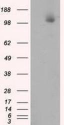 - HEK293T cells were transfected with the pCMV6-ENTRY control (Left lane) or pCMV6-ENTRY ACLY (Right lane) cDNA for 48 hrs and lysed. Equivalent amounts of cell lysates (5 ug per lane) were separated by SDS-PAGE and immunoblotted with anti-ACLY.