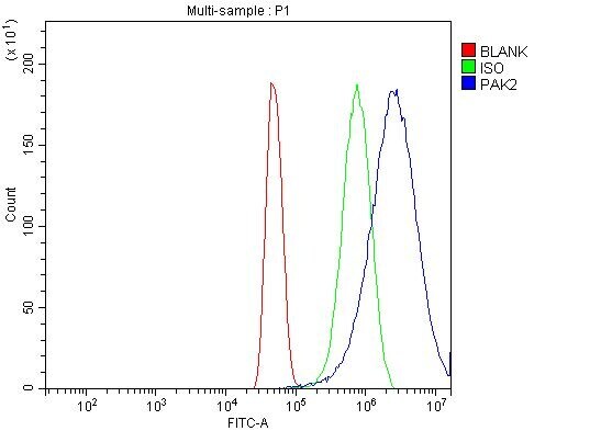 - Flow cytometry of PAK2 in U251 cells (Blue line). The cells were blocked with 10% normal goat serum, and then incubated with PAK2 polyclonal antibody (Product # PA5-143854) (1 µg/1x10^6 cells) for 30 min at 20°C. Isotype control antibody (Green line) was rabbit IgG (1 μg/1x10^6 cells) used under the same conditions. Unlabeled sample (Red line) was also used as a control. DyLight®488 conjugated goat anti-rabbit IgG (5-10 μg/1x10^6 cells) was used as secondary antibody for 30 minutes at 20°C.