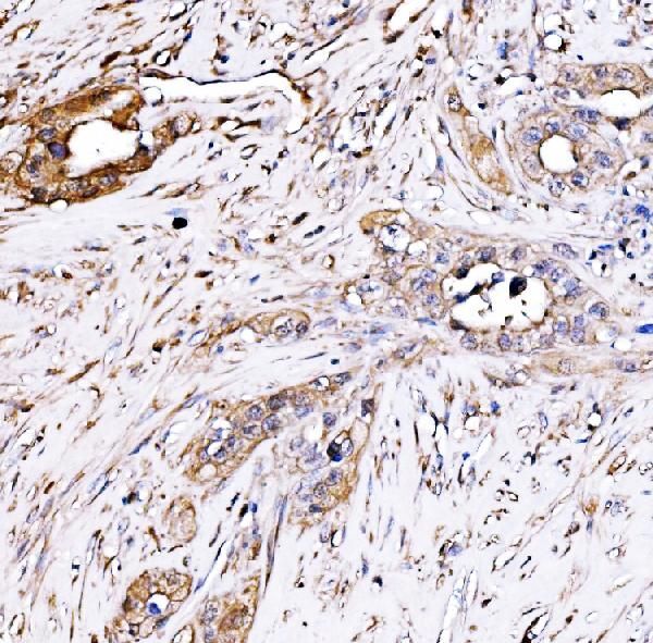 - Immunohistochemistry analysis of PAK2 in paraffin-embedded section of human appendiceal adenocarcinoma tissue. Heat mediated antigen retrieval was performed in EDTA buffer (pH 8.0, epitope retrieval solution). The tissue section was blocked with 10% goat serum. Samples were incubated with PAK2 Polyclonal antibody (Product # PA5-143854) using a dilution of 2 μg/mL overnight at 4°C. Biotinylated goat anti-rabbit IgG was used as secondary antibody and incubated for 30 minutes at 37°C. The tissue section was developed using Strepavidin-Biotin-Complex (SABC) with DAB as the chromogen.