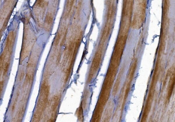 - Immunohistochemistry analysis of PAK2 in mouse skeletal muscle tissue. Heat mediated antigen retrieval was performed in EDTA buffer (pH 8.0, epitope retrieval solution). The tissue section was blocked with 10% goat serum. Samples were incubated with PAK2 Polyclonal antibody (Product # PA5-143854) using a dilution of 2 μg/mL overnight at 4°C. Biotinylated goat anti-rabbit IgG was used as secondary antibody and incubated for 30 minutes at 37°C. The tissue section was developed using Strepavidin-Biotin-Complex (SABC) with DAB as the chromogen.