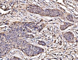- Immunohistochemistry analysis of PAK2 in paraffin-embedded section of human lung cancer tissue. Heat mediated antigen retrieval was performed in EDTA buffer (pH 8.0, epitope retrieval solution). The tissue section was blocked with 10% goat serum. Samples were incubated with PAK2 Polyclonal antibody (Product # PA5-143854) using a dilution of 2 μg/mL overnight at 4°C. Biotinylated goat anti-rabbit IgG was used as secondary antibody and incubated for 30 minutes at 37°C. The tissue section was developed using Strepavidin-Biotin-Complex (SABC) with DAB as the chromogen.