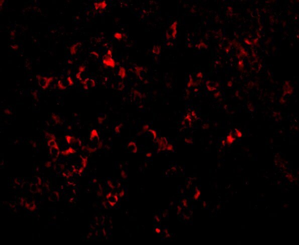 - Immunofluorescent analysis of 4% paraformaldehyde-fixed mouse spleen tissue labeling PAK2 with PAK2 Polyclonal Antibody (Product # PA5-20254) at 20 µg/mL, followed by goat anti-rabbit IgG secondary antibody at 1:500 dilution (red).
