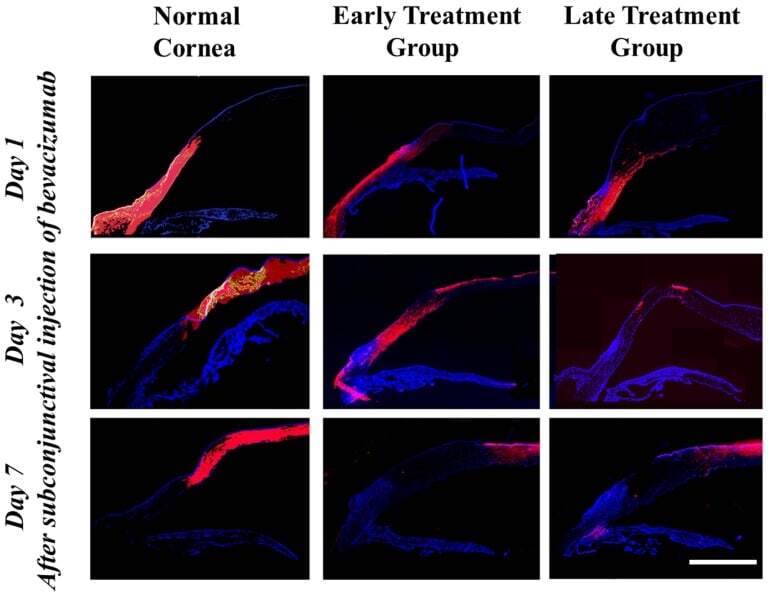 - Figure 1 Immunohistochemical staining of bevacizumab after subconjunctival injection as detected by a Cy3-conjugated IgG antibody. Time-dependent diffusion of bevacizumab into the corneal stroma was observed. Normal: eyes without induction of corneal NV. Bevacizumab molecule staining was observed in the entire thickness of corneal stroma adjacent to the injection site in all groups 1 day after the injection. The distribution of bevacizumab staining moved to the more central cornea on day 3 in all groups. On day 7, bevacizumab staining decreased dramatically in the peripheral cornea but was detected in the central cornea in all groups. Purple red: bevacizumab molecule staining; blue: DAPI staining of cell nuclei. Scale bar: 4 mm.