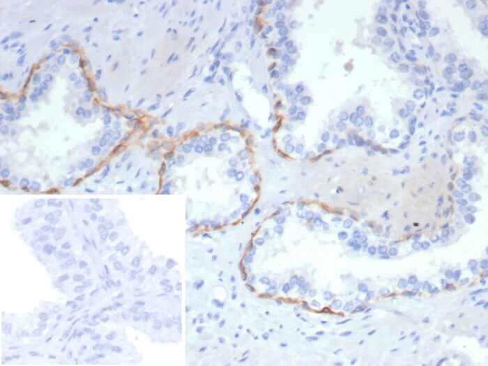 - Formalin-fixed, paraffin-embedded human prostate stained with KRT14 Recombinant Mouse Monoclonal Antibody (rKRT14/7269). Inset: PBS instead of primary antibody; secondary only negative control.
