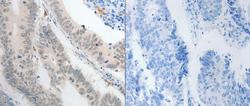 - Predicted cell location: Cytoplasm, Nucleus. Positive control: Human colon cancer tissue. Recommended dilution: 1/25-100 The image on the left is immunohistochemistry of paraffin-embedded Human colon cancer tissue using POU2F1 antibody at dilution 1/30, on the right is treated with the fusion protein. (Original magnification: x200)