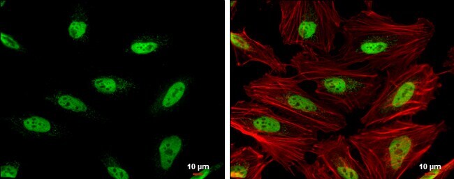 - Immunocytochemistry-Immunofluorescence analysis of OCT1 (POU2F1) was performed in HeLa cells fixed in 4% paraformaldehyde at RT for 15 min. Green: OCT1 (POU2F1) Polyclonal Antibody (Product # PA5 28209) diluted at 1:500. Red: phalloidin, a cytoskeleton marker. Blue: Hoechst 33342 staining. Scale bar = 10 µm.