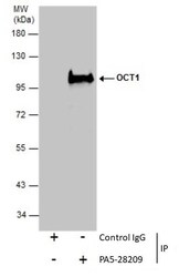 - Immunoprecipitation of OCT1 was performed in 293T whole cell extracts using 5 µg of OCT1 (POU2F1) Polyclonal Antibody (Product # PA5-28209). Samples were transferred to a membrane and probed with OCT1 (POU2F1) Polyclonal Antibody as a primary antibody and an HRP-conjugated anti-Rabbit IgG was used as a secondary antibody.