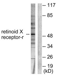 - Western blot analysis of extracts from HepG2 cells, using Retinoid X Receptor γ antibody. The lane on the right is treated with the synthesized peptide.