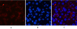 - Immunofluorescence analysis of Mouse-liver tissue. 1, CD21 monoclonal antibody (2C5) (red) was diluted at 1:200 (4°C, overnight). 2, Cy3 labled Secondary antibody was diluted at 1:300 (room temperature, 50min).3, Picture B: DAPI (blue) 10min. Picture A:Target. Picture B: DAPI. Picture C: merge of A+B
