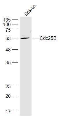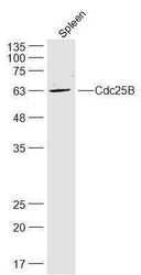 - Mouse spleen lysates probed with Cdc25B Polyclonal Antibody, Unconjugated (bs-4094R) at 1:300 dilution and 4°C overnight incubation. Followed by conjugated secondary antibody incubation at 1:20000 for 60 min at 37°C.