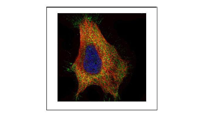 - Confocal immunofluorescence analysis (Olympus FV10i) of paraformaldehyde-fixed HeLa, using GAD65(OAGA00996) antibody (Green) at 1:500 dilution. Alpha-tubulin filaments were labeled with(Red) at 1:2500.