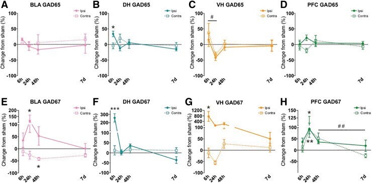- FIG. 4. Alterations in gamma-aminobutyric acid (GABA) synthesis-related proteins early after lateral fluid percussion injury (FPI). In the ipsilateral basolateral amygdala (BLA), GAD67 was increased at 24 h and decreased in the contralateral BLA at 48 h after FPI (E) . Both GAD65 and GAD67 were significantly increased in the ipsilateral dorsal hippocampus (DH) 6 h after injury (B,F) . GAD67 was also increased in the ipsilateral ventral hippocampus (VH) 6 h after FPI, where GAD65 decreased from 6 h to 24 h following FPI. (G) . In the medial prefrontal cortex (PFC), GAD67 was increased bilaterally at 24 h following injury, and significantly decreased from 48 h to 7 days in contralateral PFC. (H) . Data are represented as mean +- SEM (standard error of the mean); *** p < 0.001, ** p < 0.01, * p < 0.05, relative to sham; # p < 0.05, ## p < 0.01 across injury time-points within each blot.