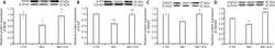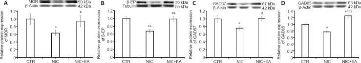 - Figure 5 Electroacupuncture effects on MOR, beta-EP, GAD67, and GAD65 protein expression in the PAG of nicotine-induced hyperalgesic rats . (A-D) Western blot analysis of MOR (A), beta-EP (B), GAD67 (C), and GAD65 (D) in the PAG of rats in the three groups. Data (mean +- SEM) are presented as relative values to control levels (CTR: n = 6, NIC: n = 6, NIC + EA: n = 6). * P < 0.05, ** P < 0.01, vs . CTR group; # P < 0.05, ## P < 0.01, vs . NIC group (one-way analysis of variance followed by Newman-Keuls multiple comparison test). CTR: Age-matched control group; NIC: nicotine-exposed group; NIC + EA: nicotine-exposed/electroacupuncture-treated group. GAD65: glutamic acid decarboxylase 65; GAD67: glutamic acid decarboxylase 67; MOR: mu-opioid receptor; PAG: periaqueductal gray; beta-EP: beta-endorphin.