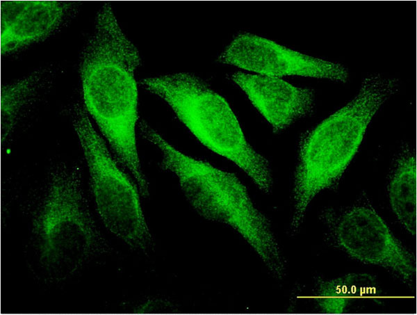 - Immunofluorescence of monoclonal antibody to CEACAM6 on HeLa cell . [antibody concentration 10 ug/ml]