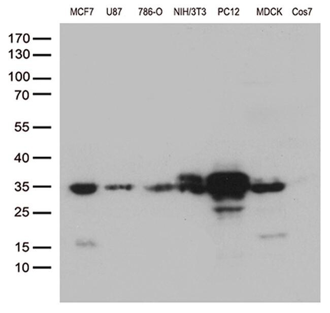 - Western blot analysis of extracts (35 µg) from 4 different cell lines by using anti-CCND1 monoclonal antibody. 1:500