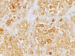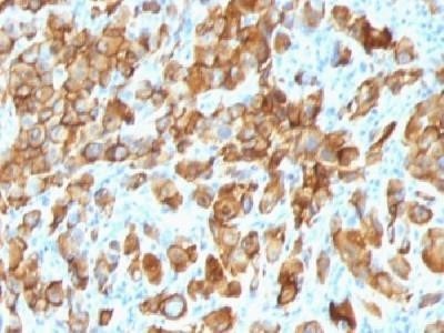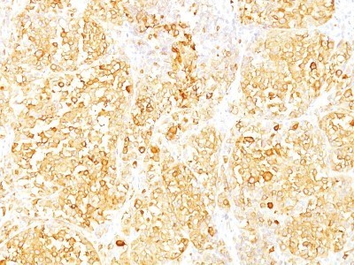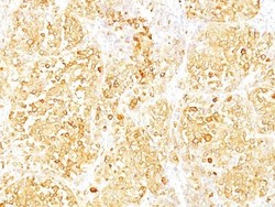 - Immunohistochemistry-Paraffin: Melan-A/MART-1 Antibody (SPM540) - Azide and BSA Free [NBP2-34786] - Formalin-paraffin human melanoma stained with Melan-A MAb (SPM540). Note cytoplasmic staining of cells.