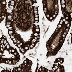 - Immunohistochemical staining of human small intestine shows strong cytoplasmic and nuclear positivity in glandular cells.