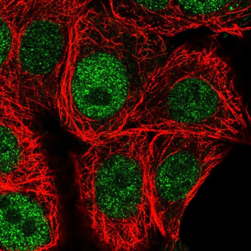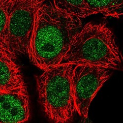 - Immunofluorescent staining of human cell line MCF7 shows localization to nucleoplasm.