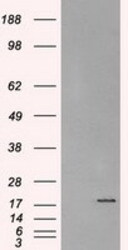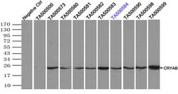 - HEK293T cells were transfected with the pCMV6-ENTRY control (Left lane) or pCMV6-ENTRY CRYAB (Right lane) cDNA for 48 hrs and lysed. Equivalent amounts of cell lysates (5 ug per lane) were separated by SDS-PAGE and immunoblotted with anti-CRYAB.