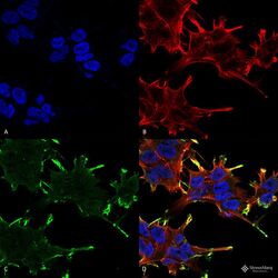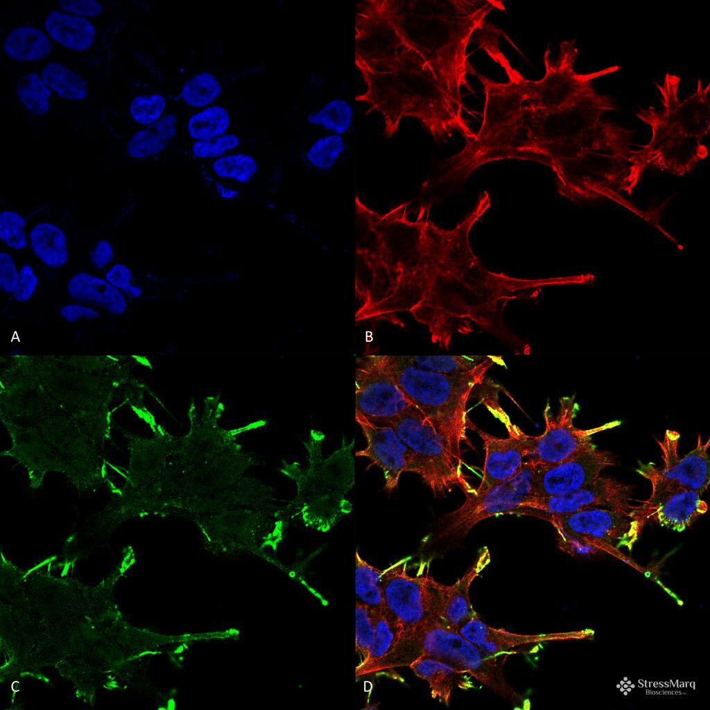 - Immunocytochemistry/Immunofluorescence analysis using human neuroblastoma cells. Fixation involved 4% Formaldehyde for 15 min at RT. Samples were incubated with Alpha B Crystallin monoclonal antibody (Product # MA5-45201) at 1:100 for 60 min at RT, followed by Goat Anti-Mouse ATTO 488 at 1:100 for 60 min at RT. Counterstain used was Phalloidin Texas Red F-Actin stain; DAPI (blue) nuclear stain at 1:1,000, 1:5,000 for 60 min RT, 5 min RT. Localization: Membrane. Magnification: 60X. (A) DAPI (blue) nuclear stain. (B) Phalloidin Texas Red F-Actin stain. (C) Alpha B Crystallin antibody. (D) Composite.