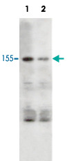 - Western blot analysis of rat brain tissue lysate (10 mg/lane). Blot was probed with NOS1 polyclonal antibody (Cat # PAB15602) at 1 : 250 (Lane 1) or 1 : 1000 (Lane 2).