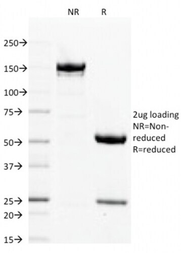 - SDS-PAGE analysis Purified Filaggrin Mouse Monoclonal Antibody(FLG/1563) (unconjugated). Confirmation of Integrity and Purity of Antibody.