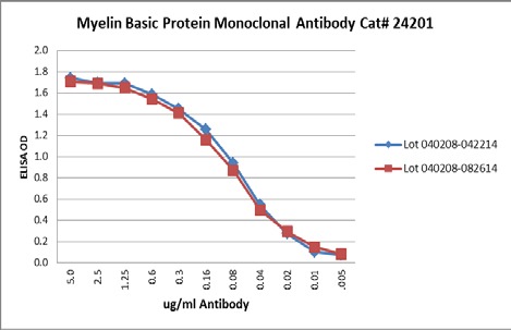 - ELISA: Human myelin basic protein coated on ELISA wells at 5ug/ml; binding detected with HRP-conjugated goat anti-mouse IgG + ABTS substrate.