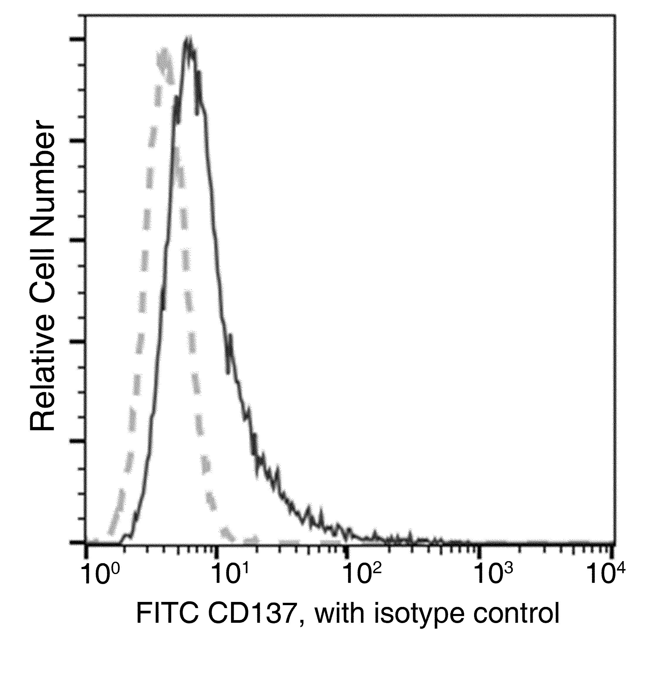 - Flow Cytometry analysis of 4-1BB (CD137) in PHA-activated human whole blood lymphocytes using CD137 Recombinant Monoclonal Antibody, FITC (Product # MA5-46631). The fluorescence histograms were derived from gated events with the forward and side light-scatter characteristics of viable lymphocytes.