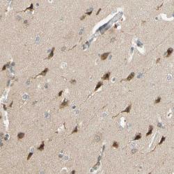 - Immunohistochemical staining of human cerebral cortex shows distinct cytoplasmic positivity in neuronal cells.