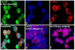 - Immunofluorescence analysis of Erythroid transcription factor was performed using log phase K-562 cells. The cells were fixed with 4% paraformaldehyde for 10 minutes, permeabilized with 0.1% Triton™ X-100 for 10 minutes, and blocked with 2% BSA for 45 minutes at room temperature. The cells were labeled with GATA1 Recombinant Rabbit Monoclonal Antibody (4H15L5) (Product # 700727) at 1:100 dilution in 0.1% BSA, incubated at 4 degree celsius overnight and then labeled with Donkey anti-Rabbit IgG (H+L) Highly Cross-Adsorbed Secondary Antibody, Alexa Fluor Plus 594 (Product # A32754), (1:2000 dilution), for 45 minutes at room temperature (Panel a: Green). Nuclei (Panel b: Blue) were stained with ProLong™ Diamond Antifade Mountant with DAPI (Product # P36962). F-actin (Panel c: Red) was stained withRhodamine Phalloidin (Product # R415, 1:300 dilution). Panel d represents the merged image showing nuclear localization. Panel e shows Jurkat cells with no expression of GATA1. Panel f represents control cells with no primary antibody to assess background. The images were captured at 60X magnification in EVOS™ M7000 Imaging System (Product # AMF7000) and externally deconvoluted (D.Sage et al. / Methods 115 (2017) 28-41).