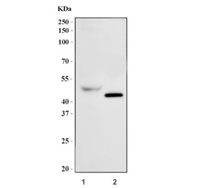 - Western blot testing of 1) human K562 and 2) mouse testis tissue lysate with GATA1 antibody. Predicted molecular weight ~43 kDa.