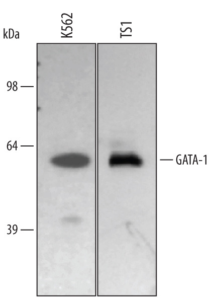 - Detection of Human GATA-1 by Western Blot. Western blot shows lysates of K562 human chronic myelogenous leukemia cell line and TS1 mouse helper T cell line. PVDF membrane was probed with 0.5 µg/mL of Human GATA-1 Antigen Affinity-purified Polyclonal Antibody (Catalog # AF1779) followed by HRP-conjugated Anti-Goat IgG Secondary Antibody (Catalog # HAF017). A specific band was detected for GATA-1 at approximately 50 kDa (as indicated). This experiment was conducted using Immunoblot Buffer Group 1.