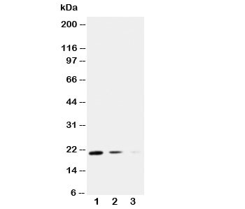 - Western blot testing of TRAIL antibody and Lane 1: recombinant mouse protein 10ng; 2: 5ng; 3: 2.5ng