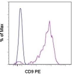 - Staining of normal human peripheral blood cells with Mouse IgG1 kappa Isotype Control PE (Product # 12-4714-81) (blue histogram) or Anti-Human CD9 PE (purple histogram). Cells in the monocyte gate were used for analysis.